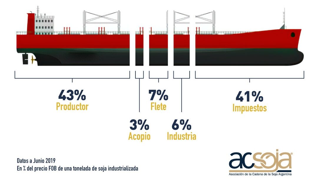 En efecto, según el gráfico de Acsoja, el 41% del valor de la carga de cada buque corresponde a tributos e impuestos (en especial las retenciones del 33%) que recauda el Estado, mientras que el 43% es el precio pagado al productor, 3% los gastos de acopio, 7% los costos del flete y solo 6% el margen que le queda a la industria que procesó y exportó el poroto.