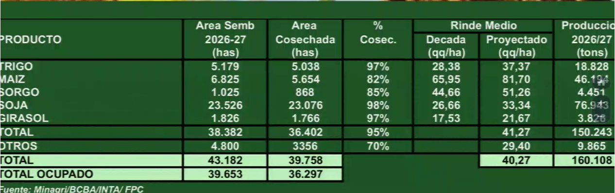 La Fundación Producir Conservando (FPC) presentó este martes en la Bolsa de Cereales de Buenos Aires sus clásicas previsiones sobre el sector agrícola argentino a largo plazo. Esta vez tomó como meta el año 2027 y aseguró que para entonces el país tendrá una cosecha de granos de 160 millones de toneladas.