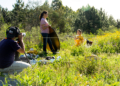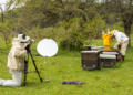 Con su traje protector y acompañada por su mamá, ella abre una de las colmenas y le explica al público la diferencia entre la abeja reina, “la mamá que camina coqueta”, las obreras y los zánganos o los “papás”.