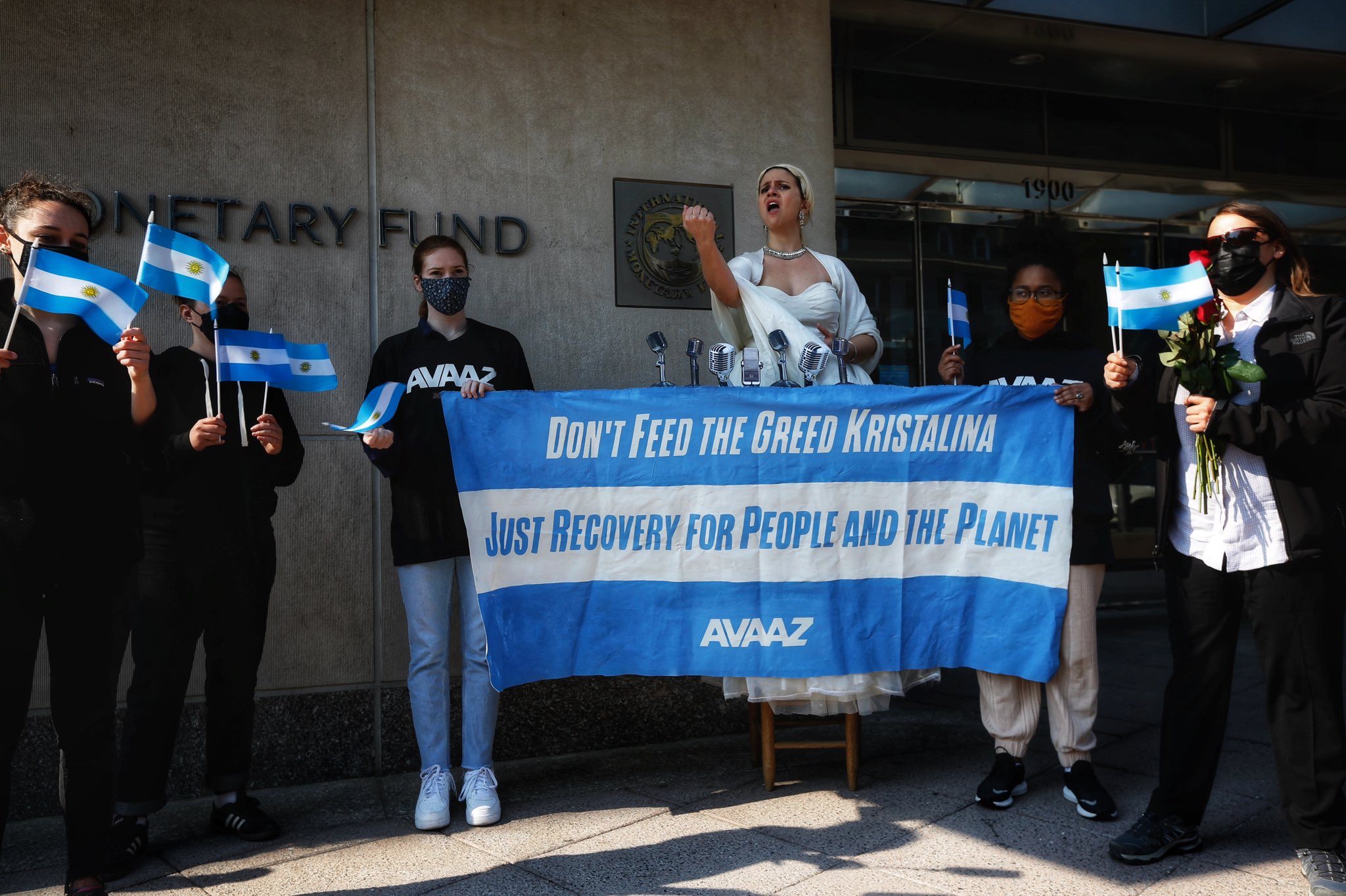 “Las cíclicas renegociaciones entre la Argentina y el FMI son la muestra más cruel de un esquema colonial e injusto que ha venido sofocando a las naciones de ingresos bajos y medios, en una espiral de endeudamiento y extractivismo para pagar las deudas externas”, aseguró el argentino Oscar Soria, director de campañas de Avaaz y organizador de la creativa protesta.