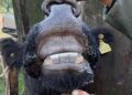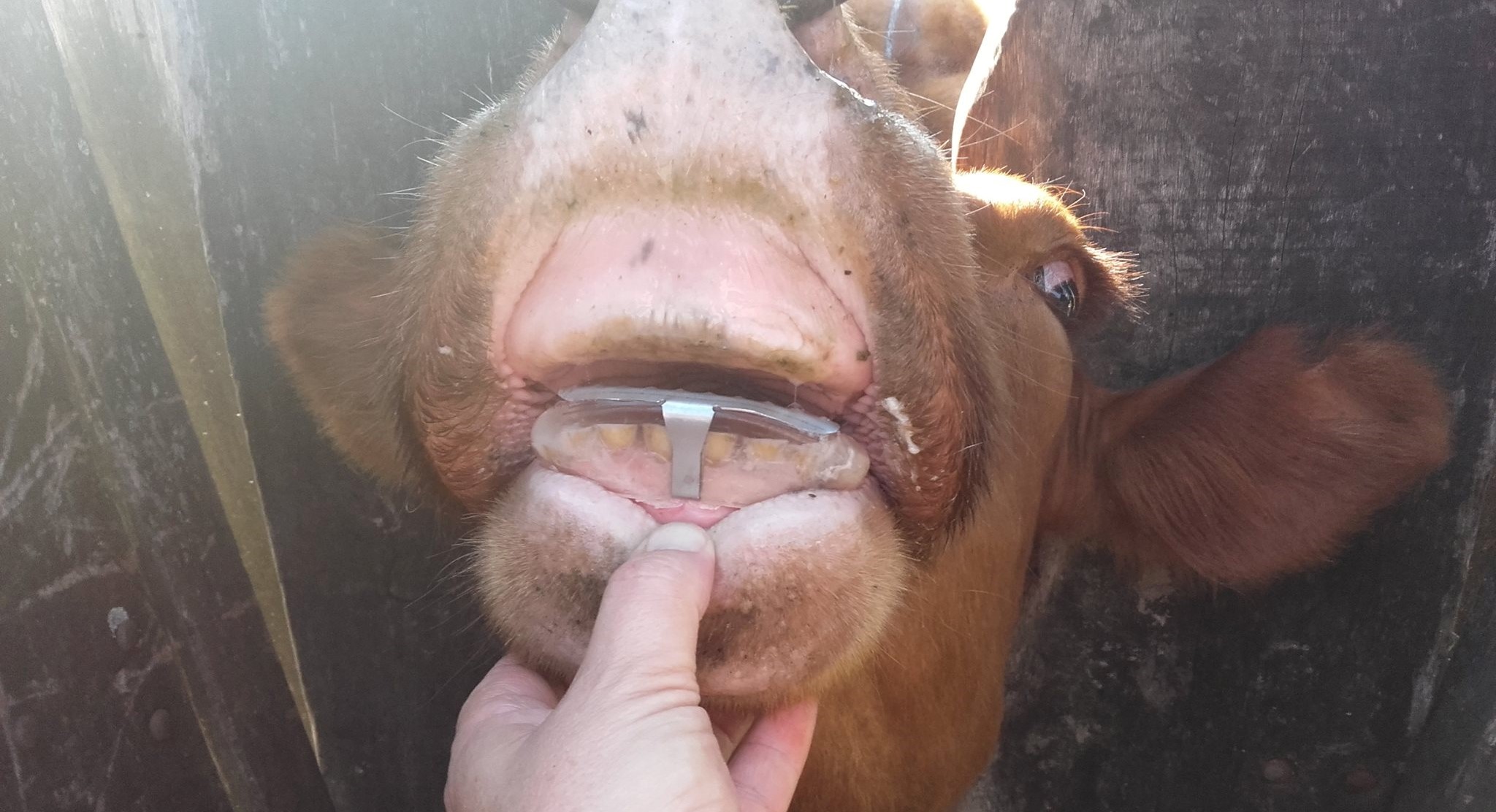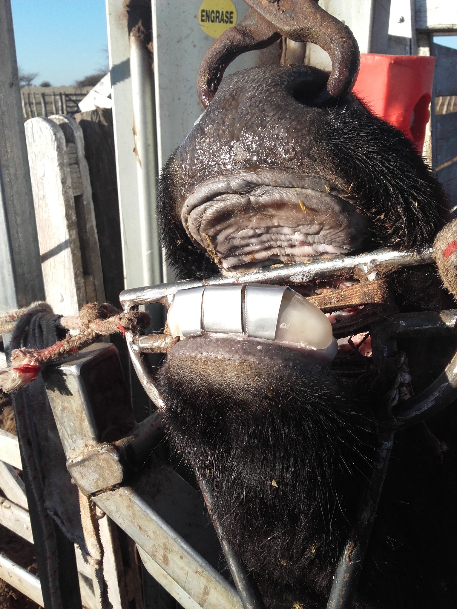 ¿Cómo se colocan? Lo indispensable en primer lugar es que el animal tenga al menos un resto de 0,8 milímetros de diente sobre la encía, para poder encastrar la prótesis. La misma consiste en un capuchón de plástico flexible, revestido en acero inoxidable, que se pega con metacrilato sobre la encía. El procedimiento es indoloro y solo se requiere que el animal esté en el cepo de la manga con la boca abierta.