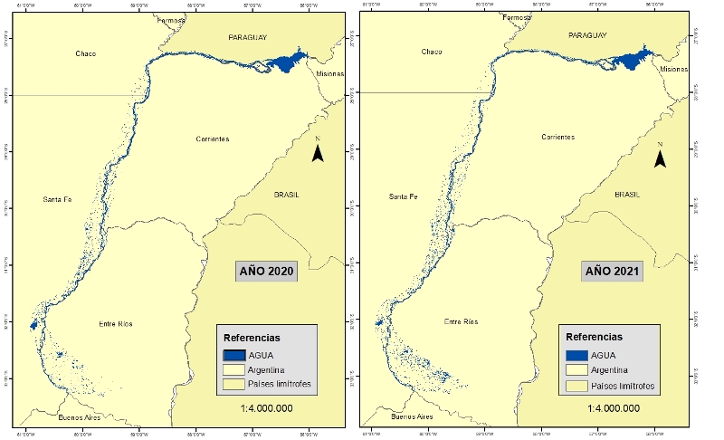 El grupo de Recursos Naturales del INTA Corrientes determinó que la superficie ocupada por el río Paraná en la actualidad (con datos de julio de 2021) es de 253.000 hectáreas, unas 150.000 hectáreas menos respecto de las 398.000 hectáreas que ocupa en un año normal, según la evidencia satelital.