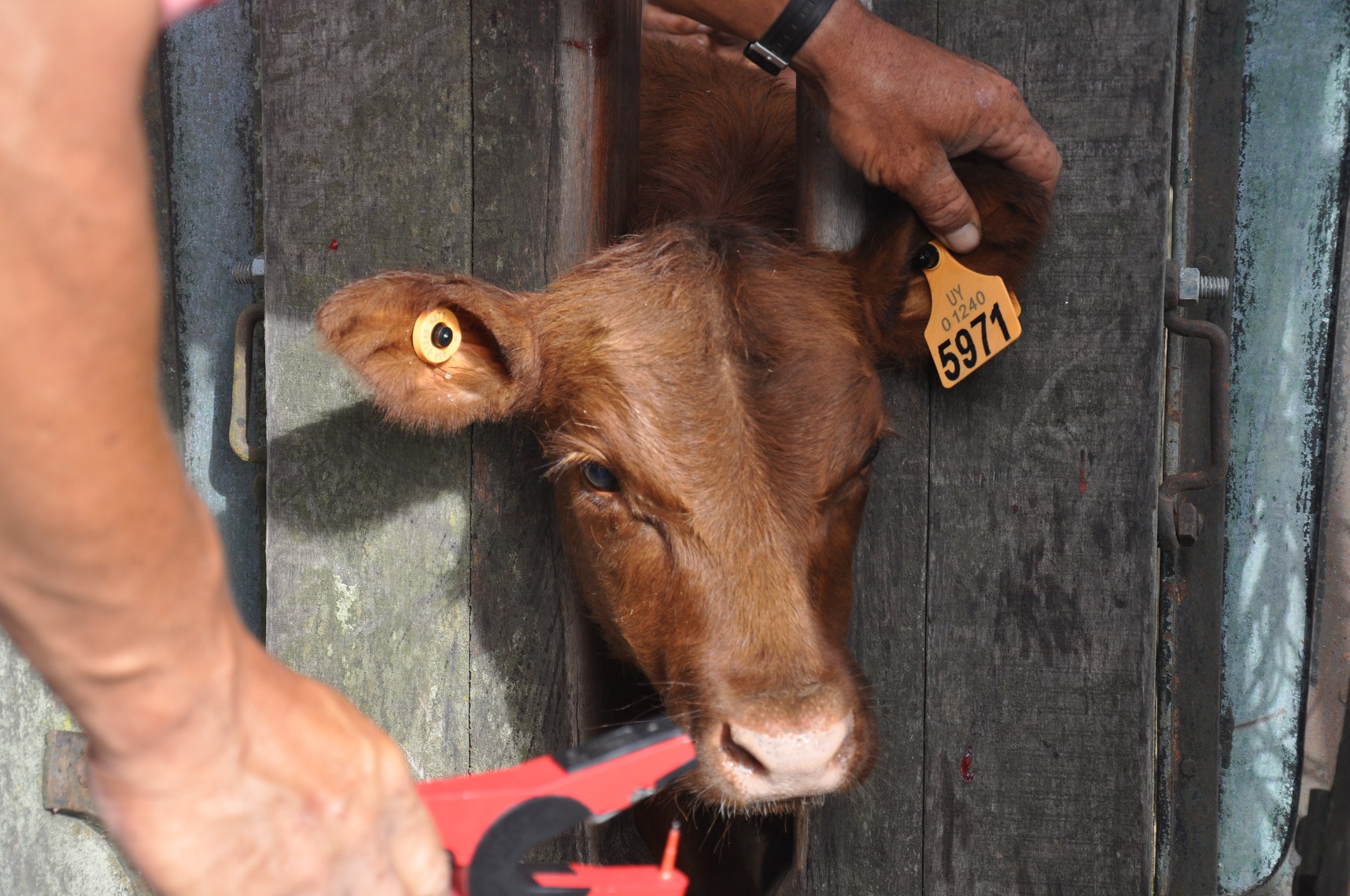 A cada cabeza de ganado vacuno –por primera vez– se le colocó en una oreja una caravana visual con el número impreso (para permitir la identificación del animal a simple vista) y en la otra un dispositivo electrónico de radiofrecuencia (para almacenar el mismo número de la caravana visual).