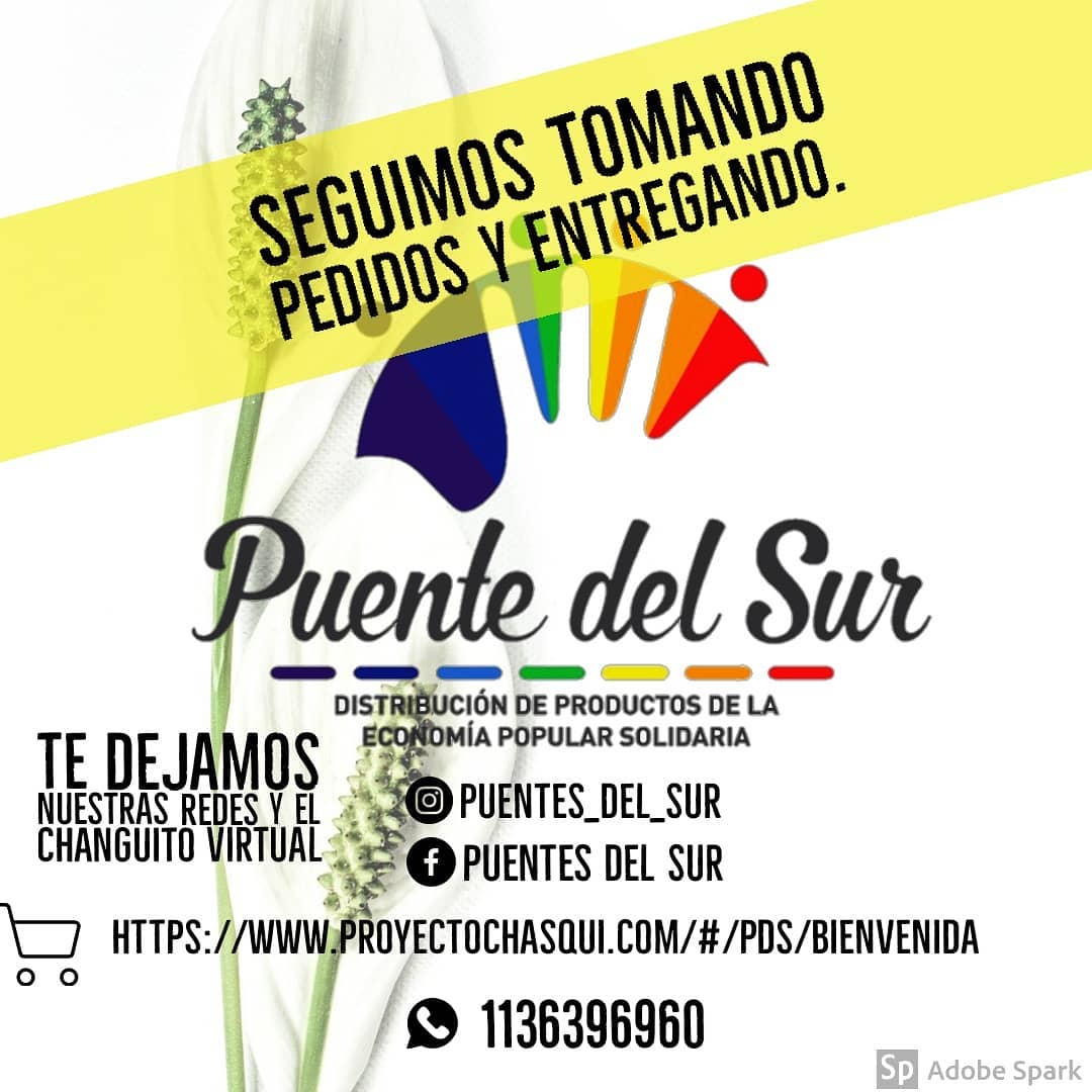 En zona oeste del GBA, Ituzaingó, Puente del Sur distribuye “productos de la economía popular solidaria” y recepcionan pedidos en puentedelsurcoop@gmail.com, realizando entregas en CABA, Gran Bs As y La Plata. A través de su página de Facebook enfatizan que su propuesta “apunta a remplazar el consumo de productos industrializados, por productos de la economía popular solidaria. Son productos que se definen fundamentalmente por no generar acumulación privada de excedentes, es decir, no tienen ganancias empresariales. La ganancia empresarial es la principal causa de nuestra situación económica actual, por eso que ; te proponemos que te solidarices”.