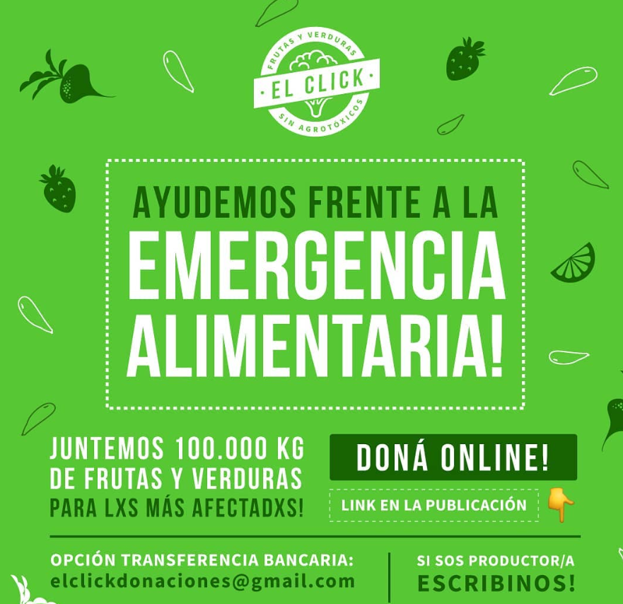A raíz del Coronavirus, lanzaron una campaña solidaria desde El Click Orgánico, para ayudar a los más afectados por el aislamiento preventivo. El objetivo es el de juntar 100.000 kilos de fruta y verdura para distribuir en comedores y organizaciones sociales. Se puede mandar un mail a elclickdonaciones@gmail.com para hacer contribuciones, e incluso invitan a productores a donar mercadería o bien a ofrecer un precio especial para esta ocasión.