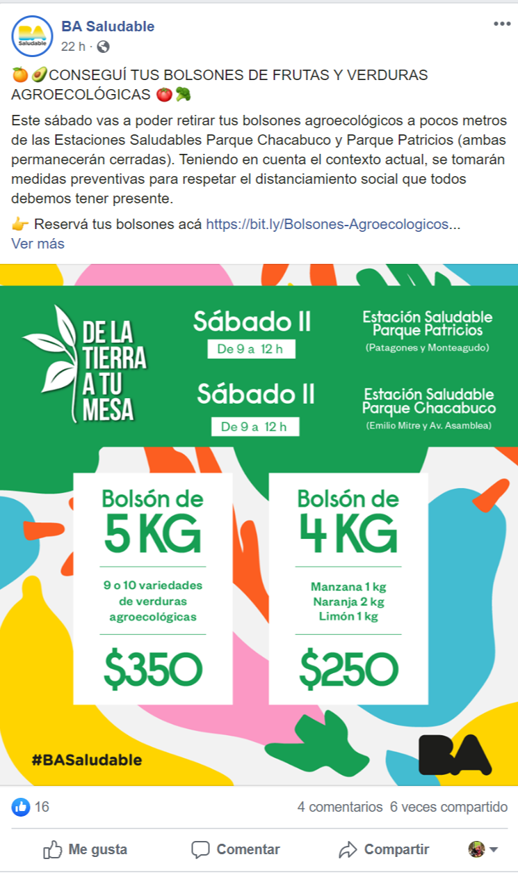 “De la Tierra a tu Mesa” por ejemplo, es una iniciativa agroecológica, que acerca este tipo de productos. Por medio de la articulación de Buenos Aires Capital Gastronómica con INTA y productores del Área Metropolitana de Buenos Aires (AMBA), ofrecen bolsones de 9 kilos de verduras de estación desde 350 pesos los sábados y domingos cada quince días, en cuatro Estaciones Saludables en distintos barrios de la Capital Federal.