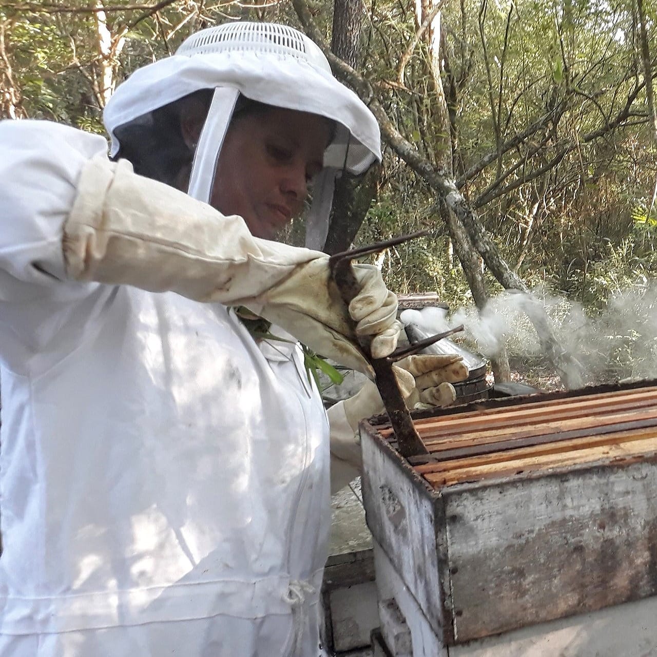 Gabriela Yurkiv es licenciada en Administración Rural con posgrado en calidad de mieles de abeja. Pertenece a la Fundación Mujeres Apícolas del Chaco que, entre otras cosas, se dedica a rescatar enjambres en peligro: hasta ahora llevan salvados alrededor de 30 enjambres de Apis mellifera y 15 de abejas nativas sin aguijón.