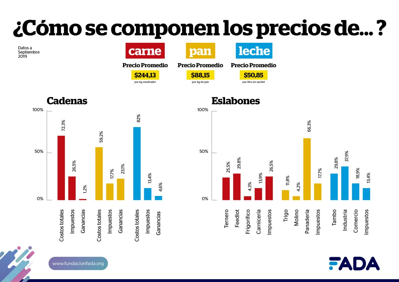 Hay una organización que metódicamente se ocupa de ir midiendo, mediante un “rastreador” de precios de tres de las principales cadenas productivas, los costos que intervienen en la formación del precio final de tres productos básicos de la canasta básica alimentaria, que es la Fundación Agropecuaria para el Desarrollo de Argentina (FADA). David Miazzo, economista jefe de esa entidad, explicó que en los precios de la carne, la leche y el pan hay un factor que se repite: “Hay un engrosamiento de los costos intermedios que hace que el productor termine excluido de la cadena”, explicó Miazzo a Bichos de Campo.