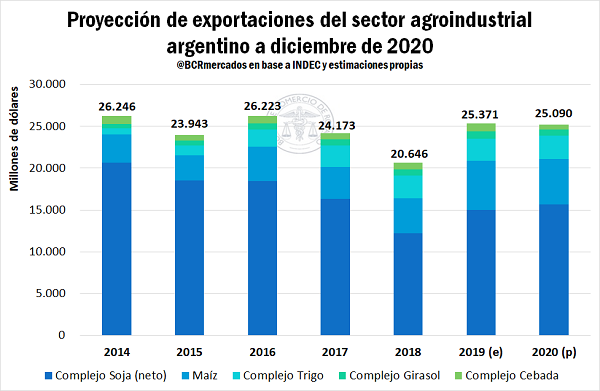 - Para el poroto de soja, la proyección de exportaciones para el 2020 ascienden a 3.140 millones de dólares, unos 350 millones menos que el año anterior.