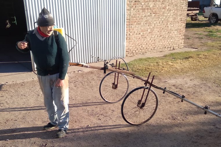 “No es una bicicleta como muchos pensaron, sino que es un carrito con una lanza que va enganchada a la espalda y se la lleva a tiro, caminando”, dijo el productor que inventó el curioso aparato, quien prefiere mantener el anonimato para no ser motivo de conversación en el pueblo (es un pueblo chico, sepan comprender). Un detalle: las ruedas no son de bicicleta, sino de manguera, para evitar que se pinchen en el lote.