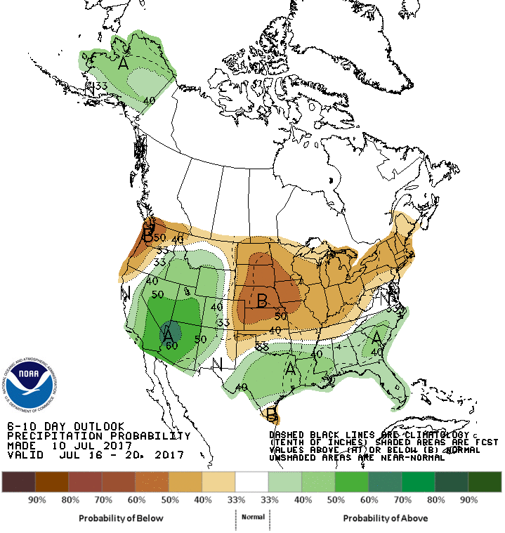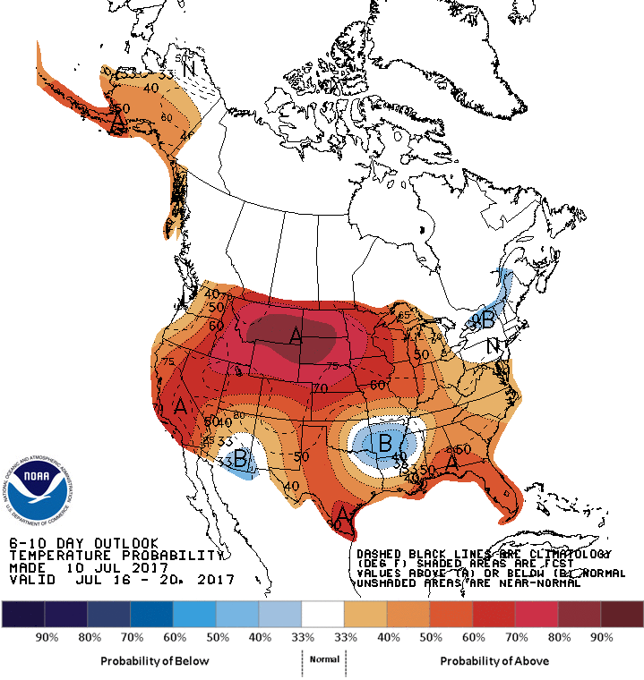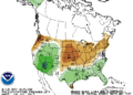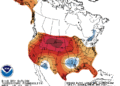 En los mapas que se adjuntan, y que fueron elaborados por la National Oceanic and Atmospheric Administration, se describe el pronóstico para las siguientes dos semanas. El primero de ellos da cuenta de las elevadas temperaturas, las zonas en rojo indican las regiones que sufrirán registros por encima de lo normal. El segundo mapa da cuenta de las perspectivas de lluvias, el color marrón indica las zonas que recibirán menos agua de lo normal.