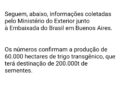 “Las cifras confirman la producción de 60.000 hectáreas de trigo transgénico, a las que se destinarán 200.000 toneladas de semillas. Estos números indican una gran inconsistencia al momento del proceso de aprobación interna en Argentina. Esta producción experimental permitiría sembrar 1,5 millones de hectáreas y producir de 4,5 a 5 millones de toneladas (equivalente al 25% de la producción argentina o al 50% del saldo exportable)”, indicó Rubens.