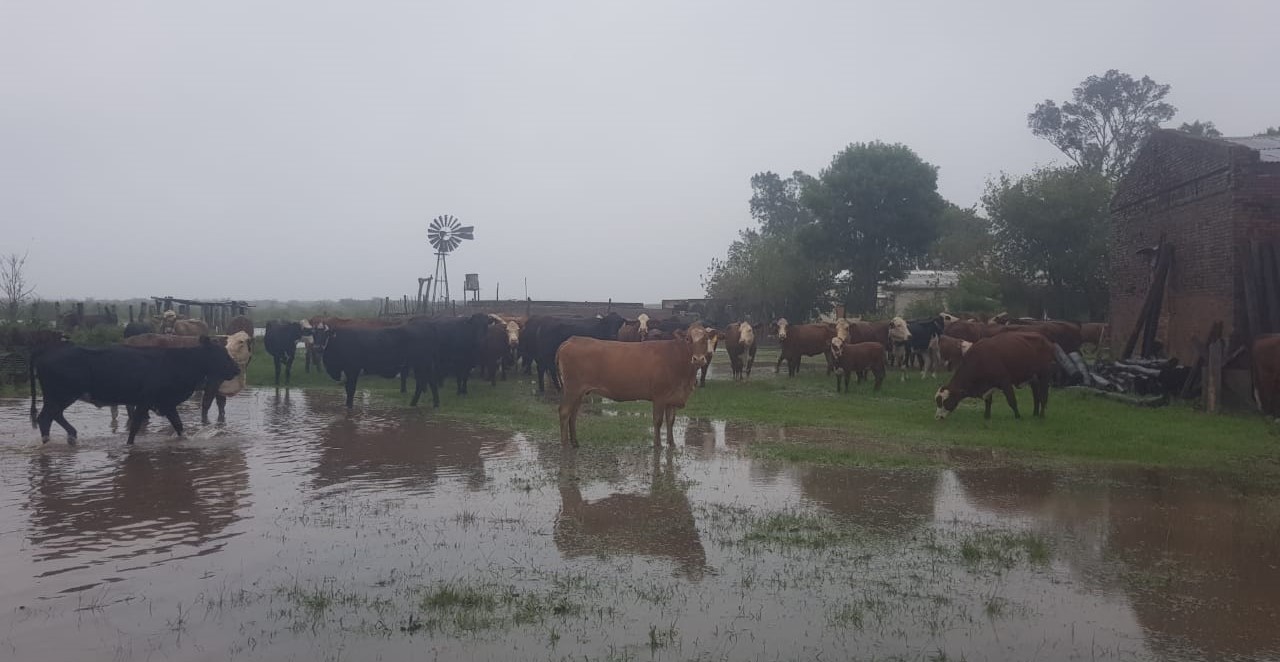 Las fotos que nos manda son de este lunes, cuando Pablo y Cristian comenzaron a correr sus 300 vacas preñadas y unos 50 terneros de la cola de parición hacia el patio de la casa rural. Es su última opción antes de sacar los animales hacia otro campo. Mantienen la secreta esperanza que deje de llover y finalmente bajen las aguas.