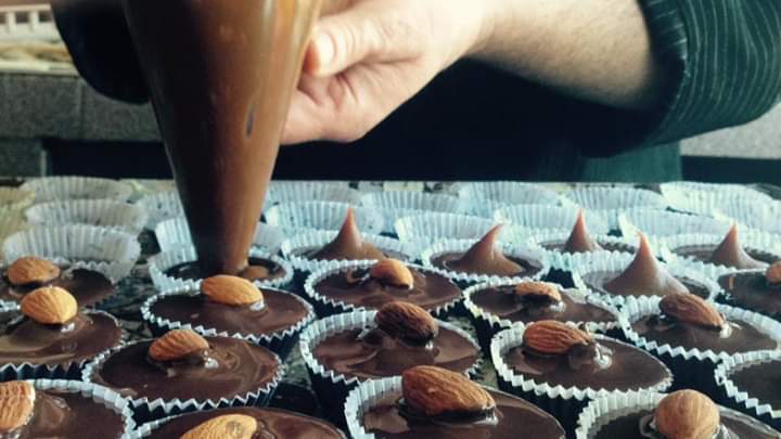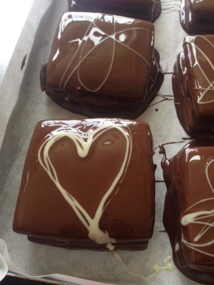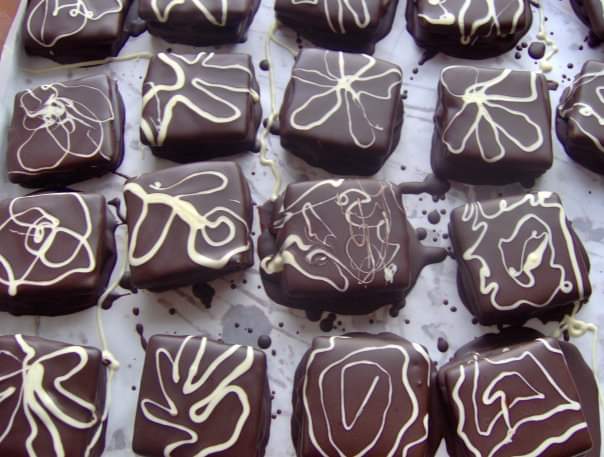 Con ese delicioso y vistoso chocolate prepara unas barras de chocolate y seis variedades de alfajores caseros con abundante relleno de dulce de leche o de mousse de chocolate blanco o negro, con cobertura de chocolate blanco o negro, con relleno de frambuesa y un alfajor triple. También prepara tortas como las que hacen las abuelas y sirve fondue de chocolate con frutas frescas para sumergir en esa delicia. Hoy ha agregado pizzas de varios gustos y fondue de queso.