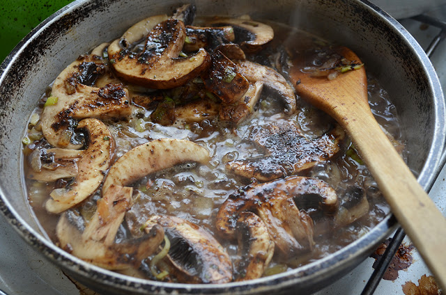 sal, hasta que se ablandan los hongos, y se le agrega el vino o whisky o cognac o ron.