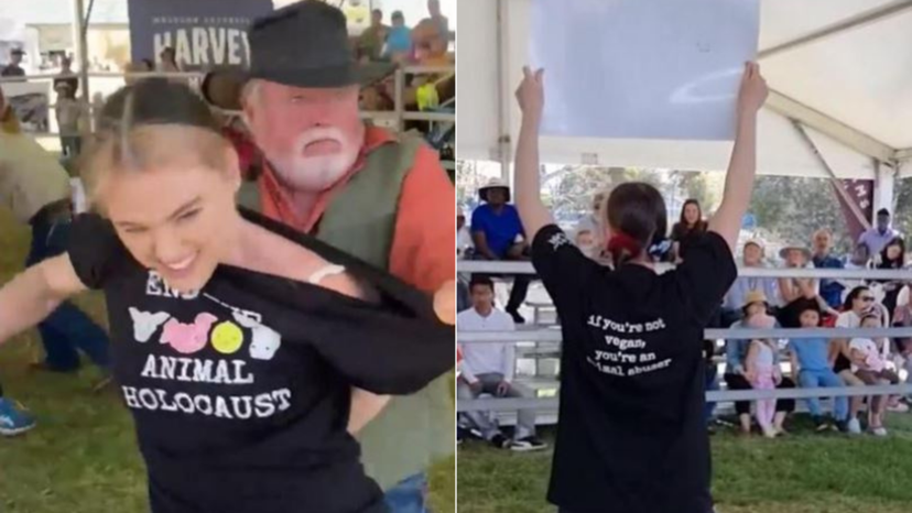 Durante una presentación ganadera realizada en la exposición anual organizada por The Royal Agricultural Society of Western Australia –institución fundada en 1831– una activista vegana, Tash Peterson, interrumpió el evento para gritar “estos seres hermosos e inocentes serán brutalmente asesinados con un disparo en la cabeza”.