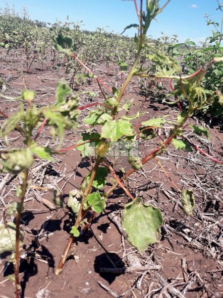 De acuerdo a la información dada por el productor, las plantas de algodón sufrieron deformaciones en las tres a cuatro hojas del extremo apical, como así también de las pequeñas ramas laterales con alargamiento de hojas, enrutamiento, deformación de nervaduras y pequeños pimpollos con la consiguiente pérdida de los mismos. Esta sintomatología es coincidente con la producida por herbicidas hormonales cuyo principio activo es 2.4D.