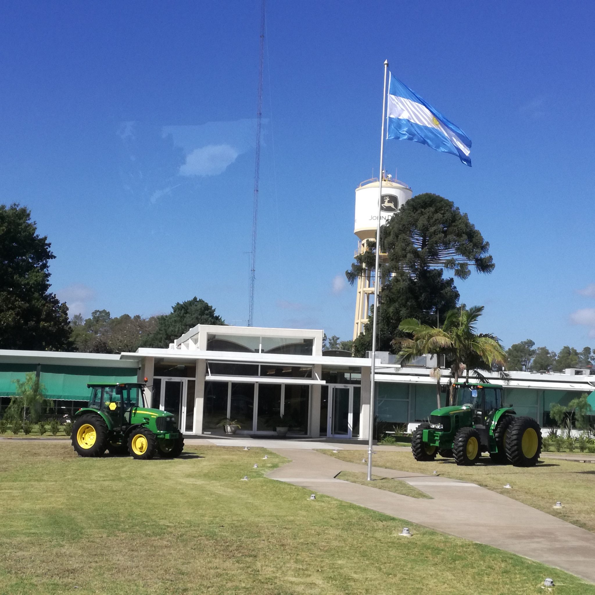 La fábrica de JD es enorme y no tiene olores, como buena planta automotriz. Finalmente allí hay fierros, chapas, pinturas y tornillos que son materiales inorgánicos, que no se pudren ni largan aromas. En la entrada al predio, la bandera argentina flamea con ganas flanqueada por dos tractores verdes, bien custodiada.