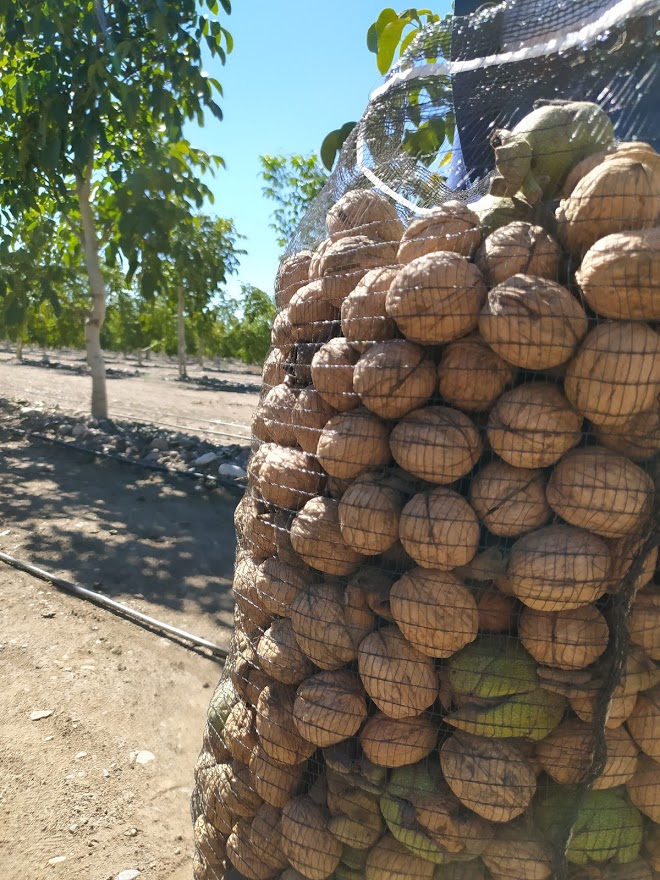 En esta finca de Tunuyán las 127 hectáreas están dedicadas a la variedad Chandler, que es una de las más adaptadas el país y la de mayor demanda a nivel global, por su color de pulpa, que es muy claro. La cosecha por ahora es semi mecanizada: con un tractor se agitan los árboles para que caigan los frutos maduros. Cuando el volumen de producción lo justifique también se mecanizará la parte de barrido y recolección de las nueces desparramadas por el suelo. Por ahora es manual. En este temporada de cosecha la empresa generó empleo para casi 40 personas.