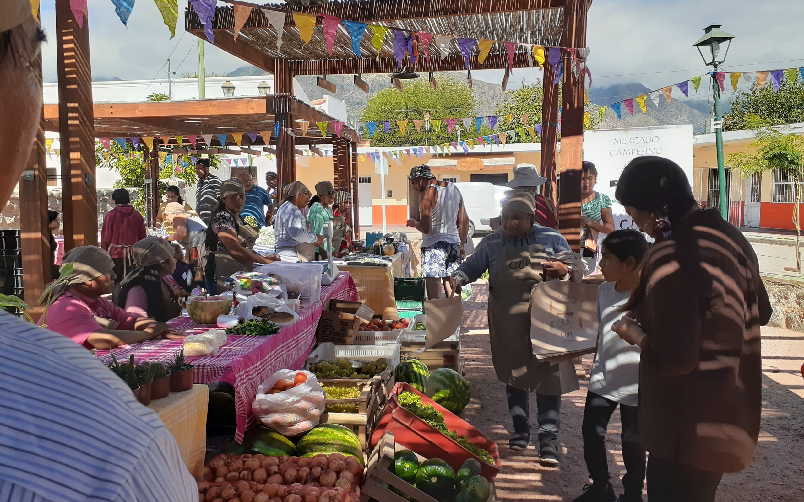Verónica me contó que allí venden los productos de sus huertas, frutas, huevos, algunos dulces y mermeladas, arropes, quesos, miel y hierbas aromáticas. Ofrecen sobre todo un bolsón de verduras y hortalizas de estación. Gracias a las y los técnicos que las asisten pudieron conseguir algunas becas para trabajar en las huertas y éstos acompañan técnicamente y apoyan la logística para para recolectar y llevar sus producciones hasta Cafayate.