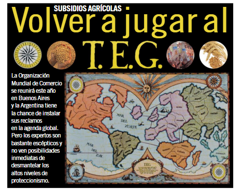 El popular juego de mesa TEG (Plan Táctico y Estratégico de la Guerra) nació en 1976. Se trata de un conflicto bélico en un forzado planisferio dividido entre 50 países. Allí las batallas se resuelven con dados, sin balas. Tampoco se usan municiones en una de las guerras que deben dar los países que, como la Argentina, producen y venden alimentos: la lucha contra los subsidios agrícolas. Esa pelea se inició diez años después aquel juego, en 1986. Pasaron más de treinta años y, como en el TEG, se hace largo el desenlace.